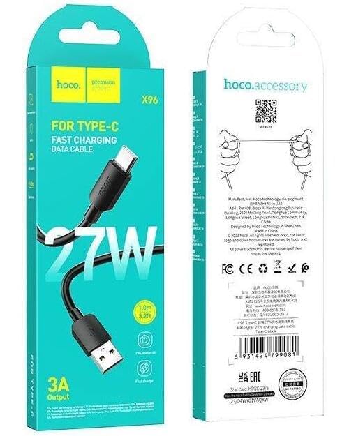 HOCO - كابل شحن ونقل بيانات X96 هايبر 27 وات نوع سي (1 متر - 3 أمبير) متوافق مع سامسونج وهواوي وشاومي وأوبو من هوكو، لون أسود
