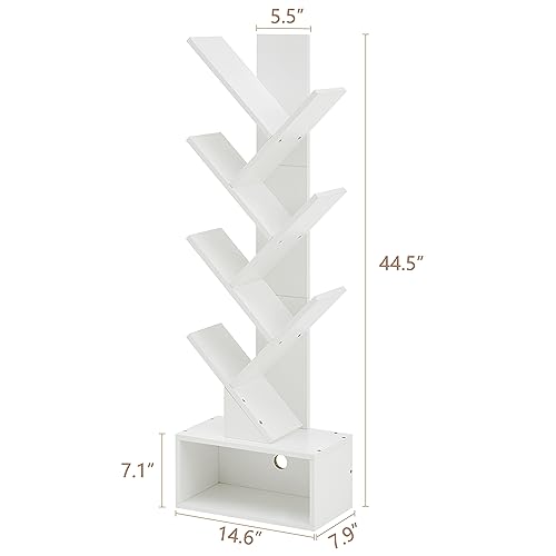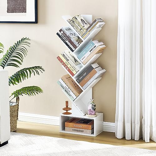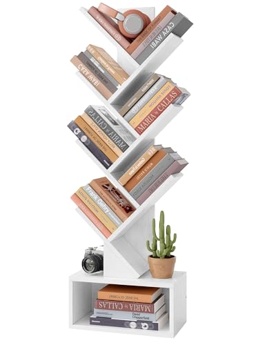 Hoctieon - رف كتب على شكل شجرة مكون من 6 طبقات من هوكتيون، خزانة كتب مع ادراج، خزانة كتب قائمة بذاتها، رف عرض قائم على الارض للكتب، ارفف منظمة للكتب للمنزل والمكتب وغرفة المعيشة وغرفة النوم، ابيض