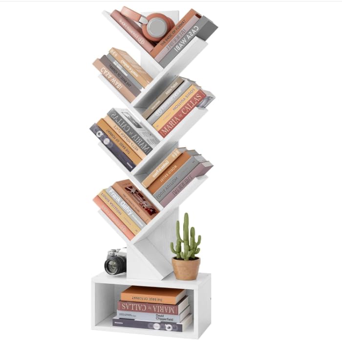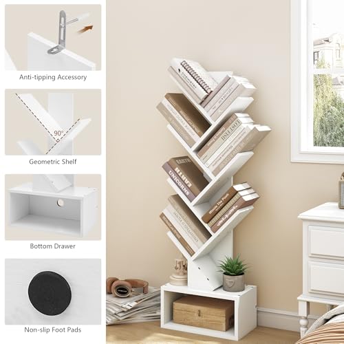 Hoctieon - رف كتب من 6 طبقات بتصميم شجرة من هوكتيون، خزانة كتب طويلة مع درج، رف كتب قائم بذاته، رف تخزين قائم على الارض، ارفف منظمة للكتب للمنزل والمكتب وغرفة المعيشة وغرفة النوم، ابيض