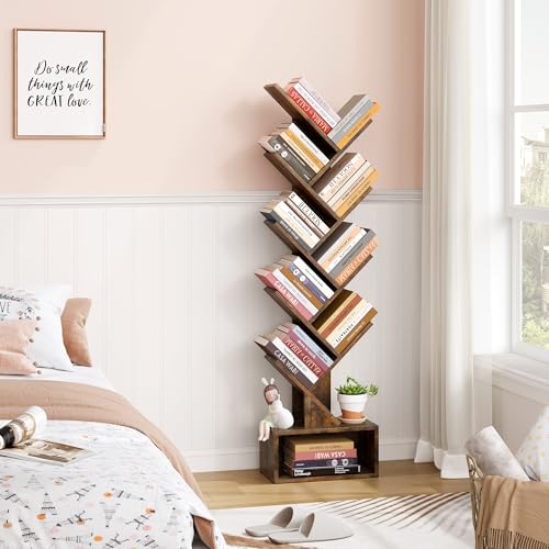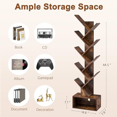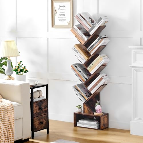Hoctieon - رف كتب بتصميم شجرة من 9 طبقات من هوكتيون، خزانة كتب طويلة مع درج، رف كتب خشبي، ارفف كتب عصرية قائمة على الارض، ارفف منظمة للكتب لغرفة النوم وغرفة المعيشة والمكتب المنزلي، بني ريفي