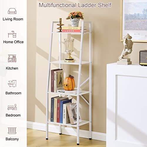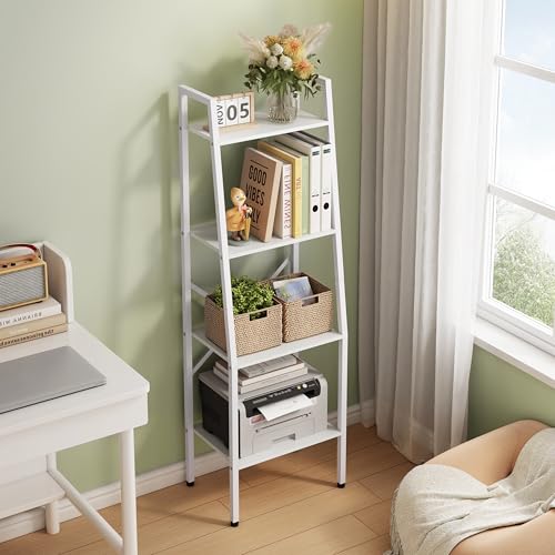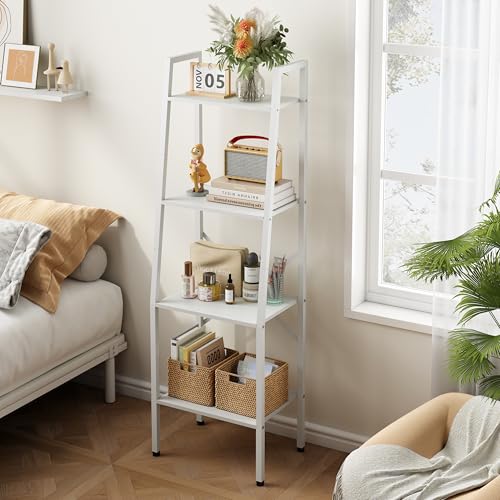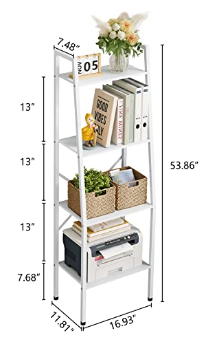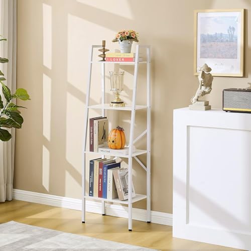 Hoctieon - خزانة كتب بتصميم سلم من 4 طبقات من هوكتيون، رف كتب طويل مع اطار معدني، سلم صناعي لغرفة المعيشة والمطبخ والمكتب المنزلي وغرفة النوم، تجميع بسيط، ابيض، خشب هندسي من الحديد