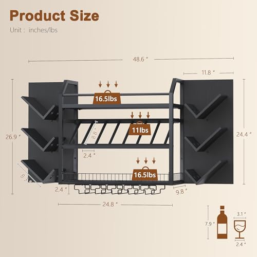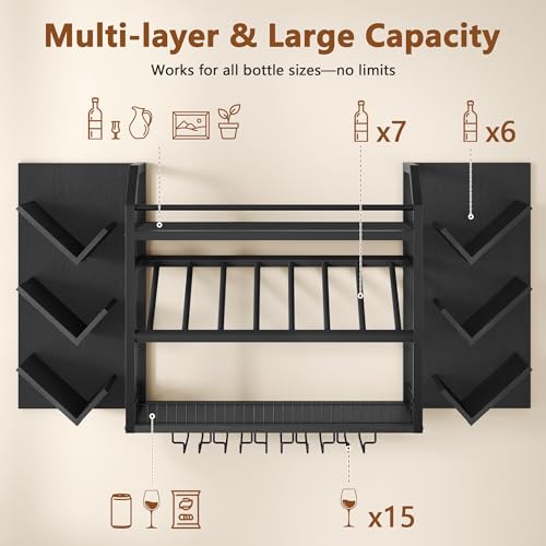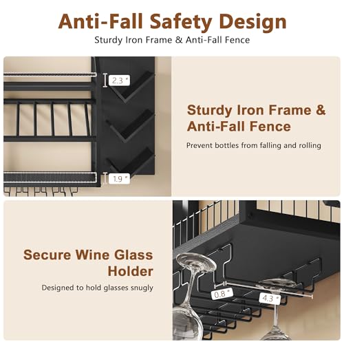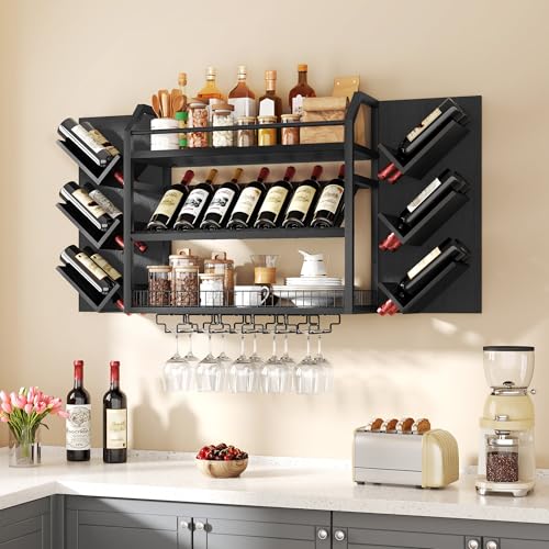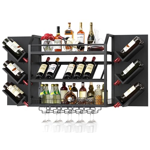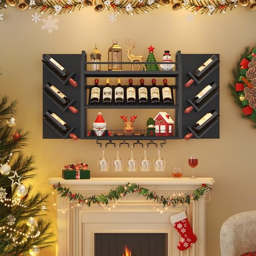 Hoctieon - رف مشروبات يثبت على الحائط من هوكتيون، رفوف نبيذ معلقة من 3 طبقات مع حامل زجاج، ارفف بار بسعة كبيرة، تخزين عرض زجاجات خشبية معدنية للمطبخ والمنزل والبار وغرفة الطعام، اسود