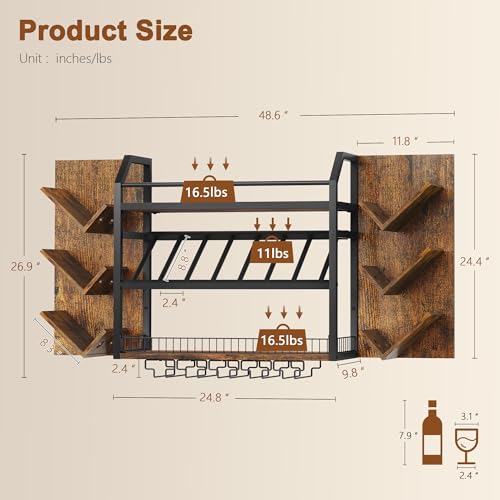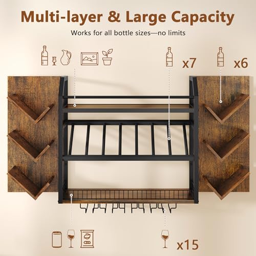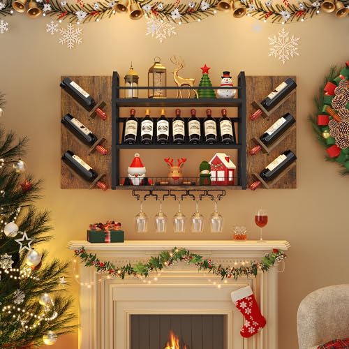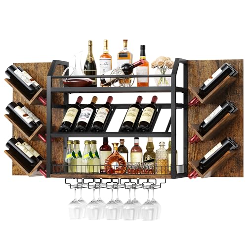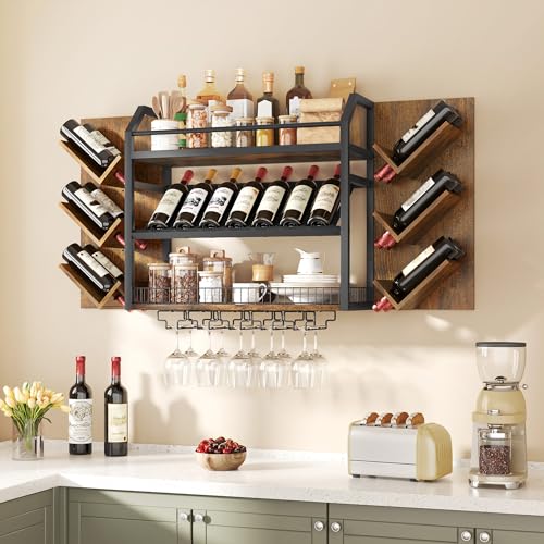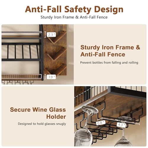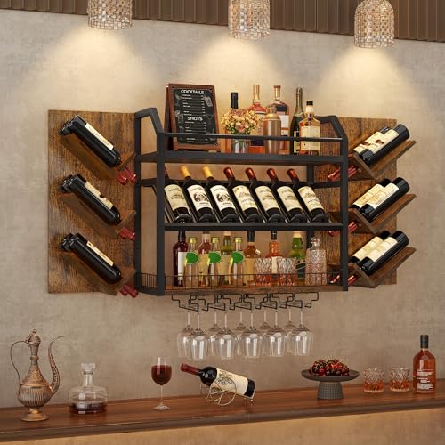 Hoctieon - رف مشروبات يثبت على الحائط من هوكتيون، رفوف نبيذ معلقة من 3 طبقات مع حامل زجاج، ارفف بار بسعة كبيرة، تخزين عرض زجاجات خشبية معدنية للمطبخ والمنزل والبار وغرفة الطعام، بني ريفي