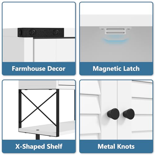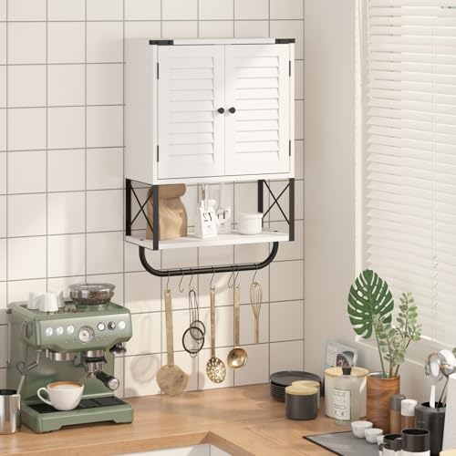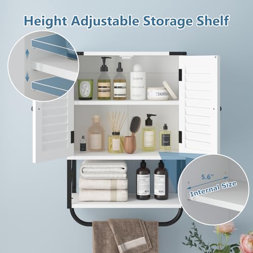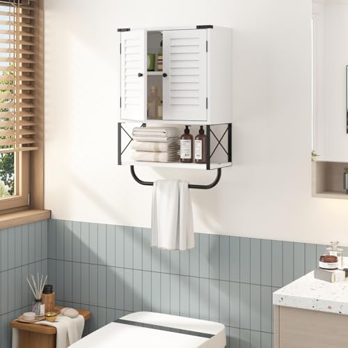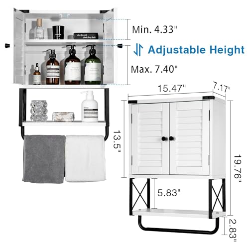 HOKYHOKY - خزانة حائط للادوية للحمام من هوكيهوكي، 22.6 انش × 15.5 انش × 7.2 انش، خزانة تخزين صغيرة معلقة للحمام مع ابواب كوة، منظم خزانة ادوية يثبت على الحائط مع قضيب منشفة، ابيض، معدن خشبي هندسي