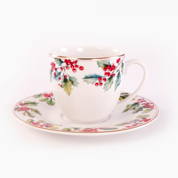 - محتويات المجموعة: تتضمن المجموعة المكونة من 12 قطعة أكواب وصحون مطابقة تتميز بنمط ساحر بطابع الكريسماس من التوت الأحمر وأوراق هولي الخضراء
