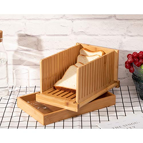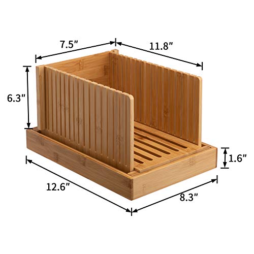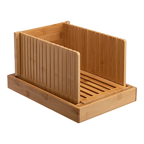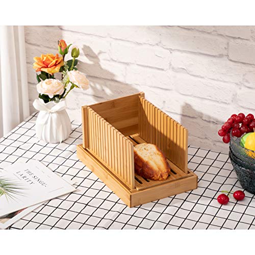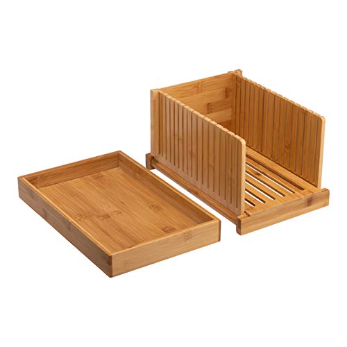 HollyHOME - قطاعة خبز من الخيزران لرغيف الخبز المنزلي مع حامل للفتات من هولي هوم، حامل تقطيع خبز صغير قابل للطي مناسب للخبز والكعك والخبز إلى شرائح رفيعة أو سميكة، لون ناتشرال