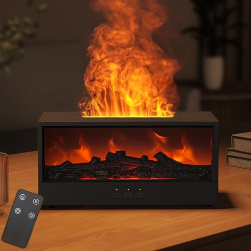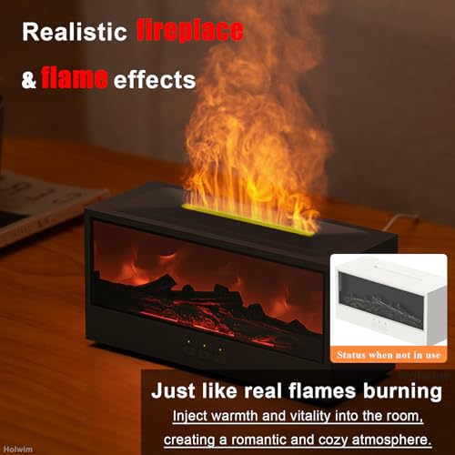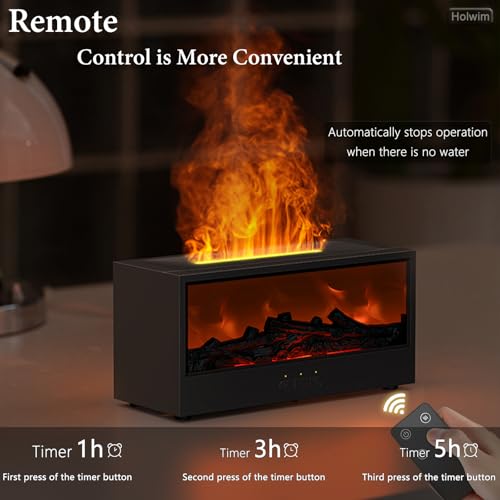 Holwim - موزع زيوت عطرية على شكل مدفأة صغيرة، مرطب رذاذ بارد بالموجات فوق الصوتية مع جهاز تحكم عن بعد، إيقاف تلقائي عند نفاذ الماء ومؤقت للمنزل، موزع روائح علاجية بلهب ناري بـ 7 ألوان من هولويم، أسود