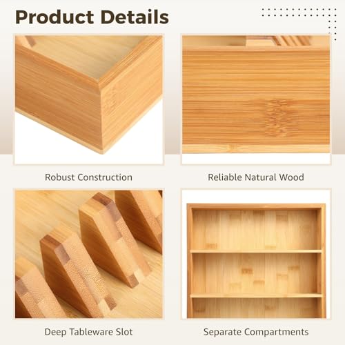 - مساحات تخزين واسعة ومنفصلة: تتميز بـ 3 أقسام مرتبة بعناية - قسمين أفقيين ومساحة تخزين عمودية واحدة مع 6 فتحات؛ أخاديد عميقة 2 انش تثبت الشوك والملاعق والقواطع بأمان في مكانها