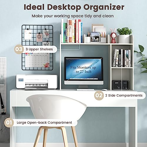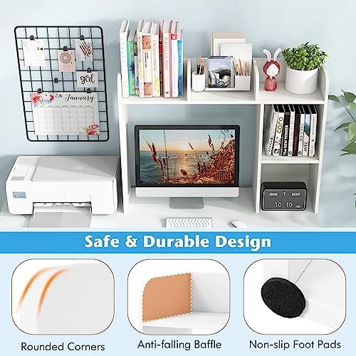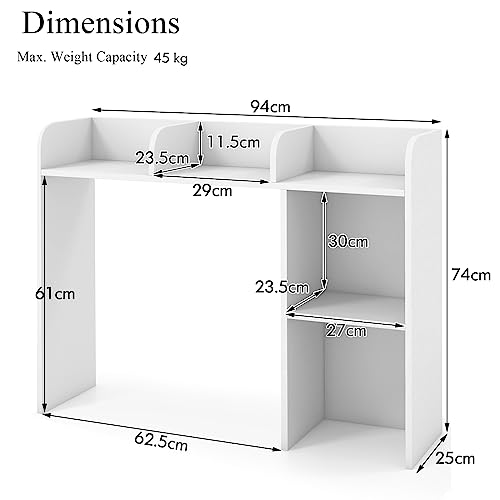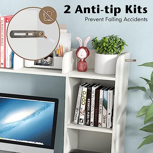 HOMASIS - رف مكتب من هومسيس بـ 5 أرفف مفتوحة، حامل مكتب خشبي مع رف كتب، منظم طاولة متعدد الوظائف مع جهاز مضاد للإمالة، رف طاولة للدراسة والمكتب (لون أبيض)