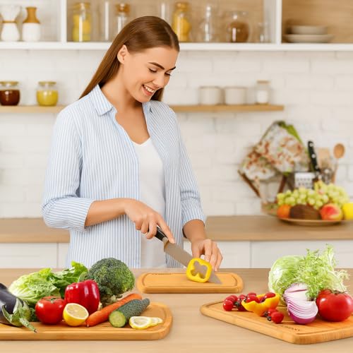 - طقم ألواح تقطيع بامبو متعددة الأغراض من هوماكسي: لا تسهل فقط تحضير اللحوم والخضروات والمكونات الأخرى، بل يمكن استخدامها كصواني لتقديم الجبن وصواني المقبلات، وغيرها. مجموعة مريحة من 3 قطع، وتشمل: لوح تقطيع كبير جدًا (45.7 × 31.75 سم)، لوح تقطيع كبير (36.83 × 29.21 سم)، ولوح تقطيع صغير (30.48 × 22.86 سم)، مما يتيح لك إتمام جميع مهام التقطيع، وتحضير الوجبات، وحتى التقديم بسهولة.