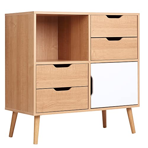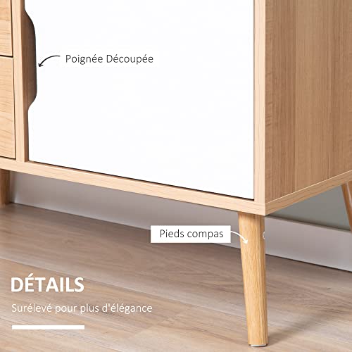 HOMCOM - دولاب جانبي لغرفة الطعام والمطبخ مع أدراج على الأرجل مع 4 أدراج وخزانة بتصميم اسكندنافي بلون أبيض ومظهر خشبي فاتح من هوم كوم