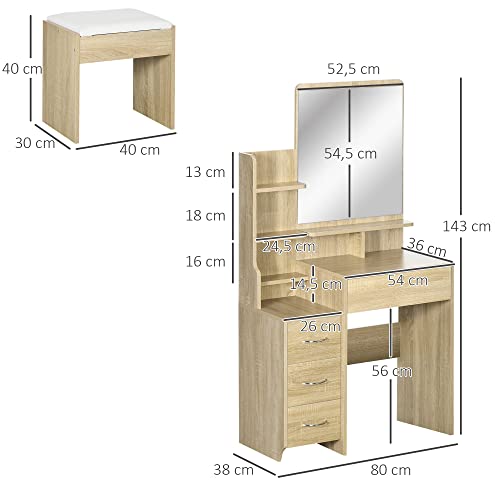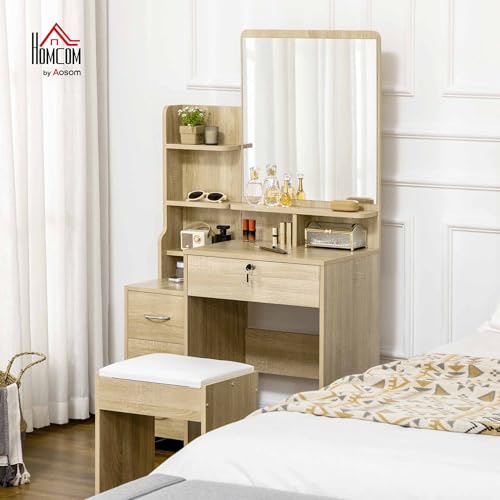 HOMCOM - طقم تسريحة من هومكوم بمراية كبيرة ومقعد مبطن + ارفف مفتوحة متعددة + 4 ادراج، مصنوعة من الخشب الطبيعي
