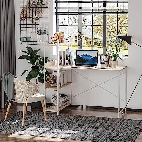 HOMCOM - مكتب كمبيوتر صناعي بنمط كلاسيكي للمنزل والمكتب مع رف تخزين من 4 طبقات بإطار معدني للمنزل والمكتب من هومكوم، لون البلوط