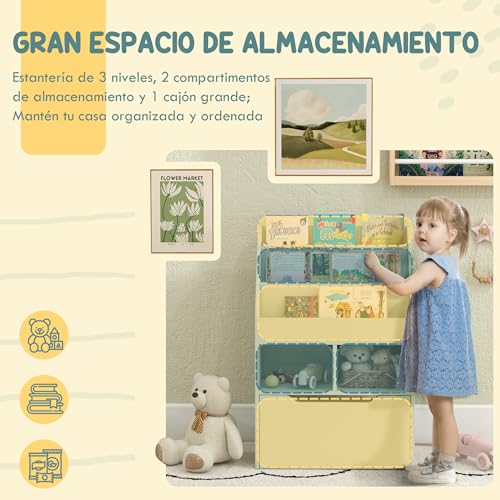 HOMCOM - خزانة كتب خشبية للأطفال من هومكوم مع 3 مساحات تخزين و2 مكعب ودرج متحرك 4 عجلات لغرفة الأطفال وغرفة اللعب 60 × 30 90 سم لون أخضر خشب مُصنع