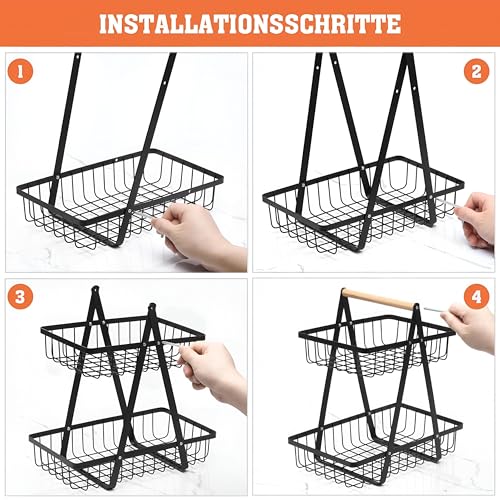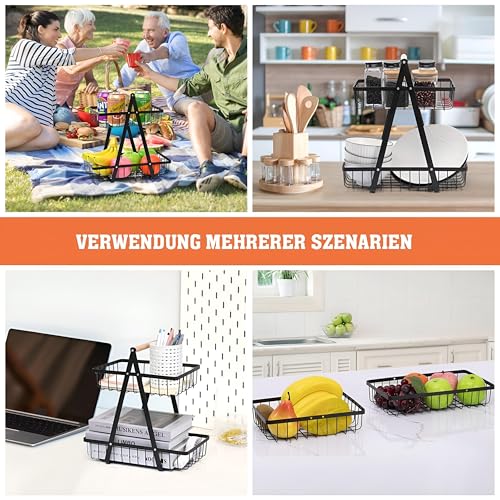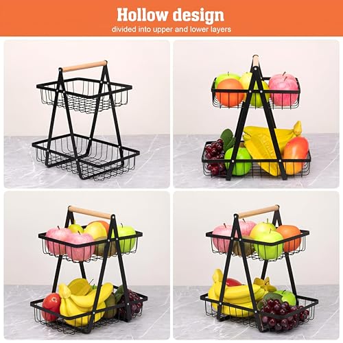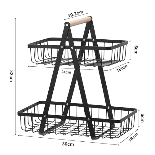 LC - ديكور منزلي - حامل سلة فواكه وخضروات معدني أنيق من طبقتين بمقبض خشبي، مثالي لإضافة الأناقة والعملية إلى مطبخك أو مكتبك