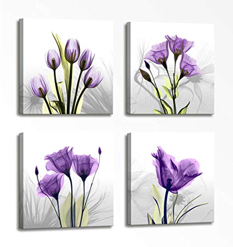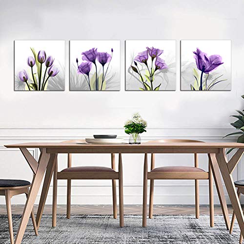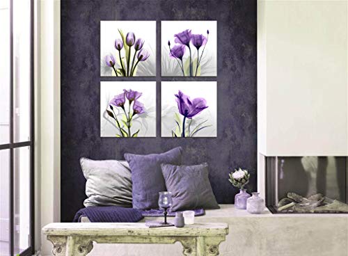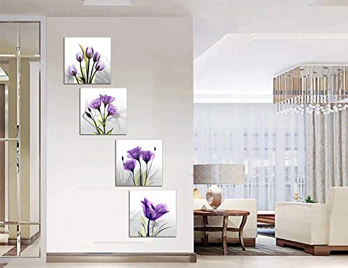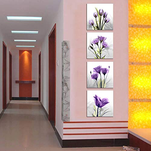 Moyedecor Art - مجموعة ديكورات منزلية لغرفة المعيشة - 4 لوحات قماشية مؤطرة بحجم 40.64×40.64 سم، مطبوعات فنية عصرية كبيرة الجودة، تصور تركيبة زهور التوليب الأنيقة باللون الأرجواني، مناسبة لغرف النوم والمكاتب