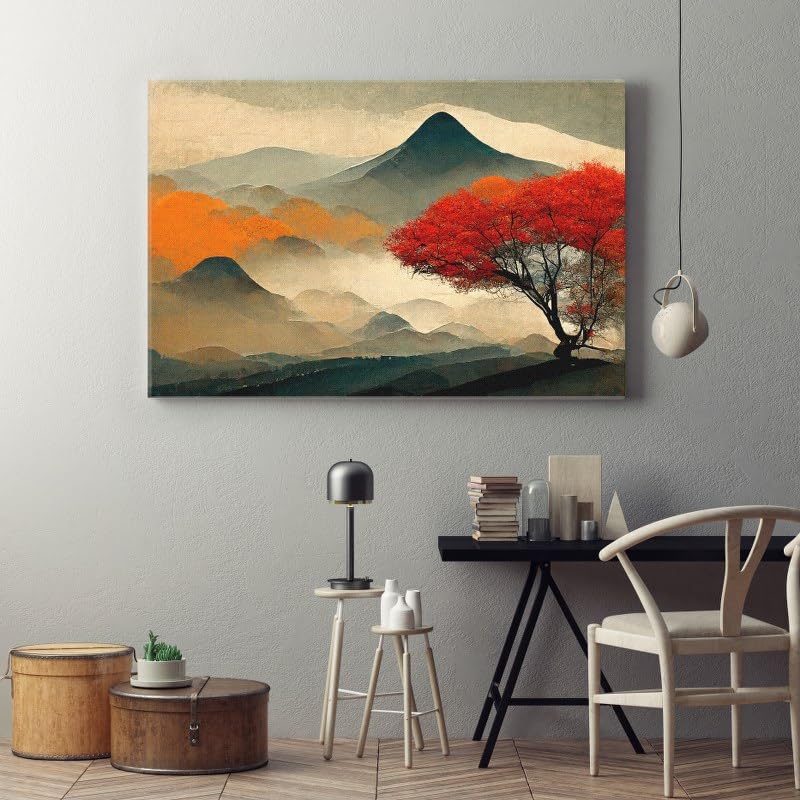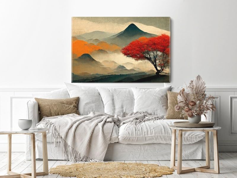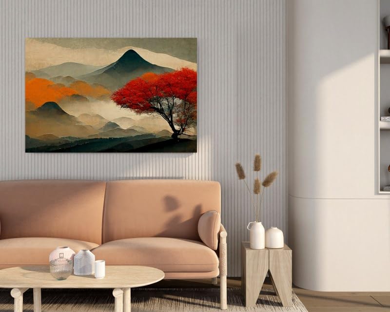 Home Gallery - لوحة فنية بتصميم منظر طبيعي ياباني لفصل الخريف والجبال ومنحدر جبلي ينمو عليه أشجار الريد وود من هوم جالاري، مقاس 60 × 40 سم