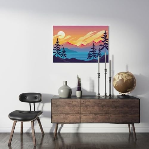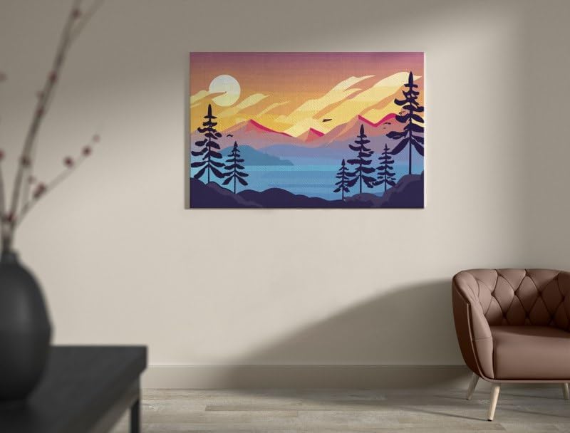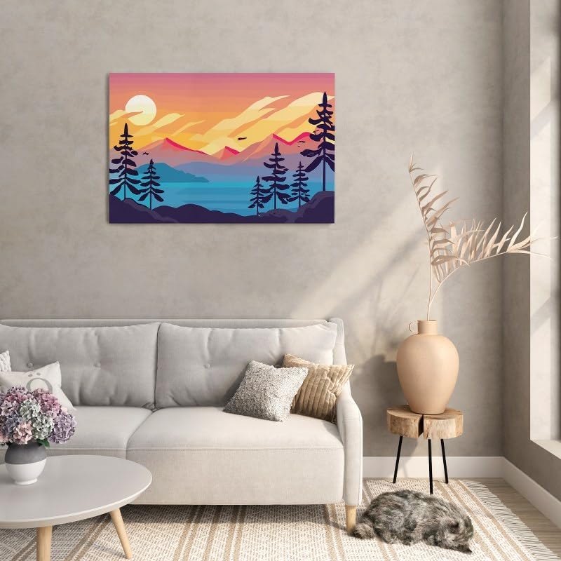 Home Gallery - لوحة فنية جدارية من القماش بتصميم بوهو مطبوع عليها المناظر الطبيعية المجردة والجبال والبحيرة مقاس 90 × 60، بيج