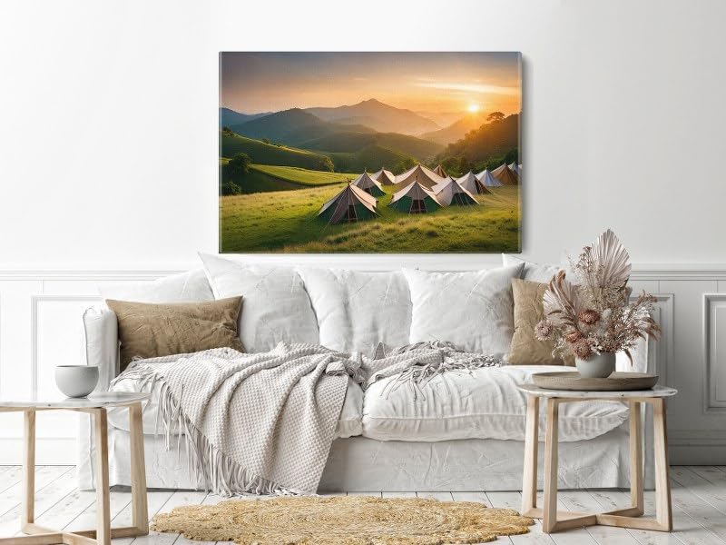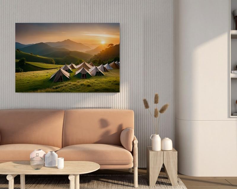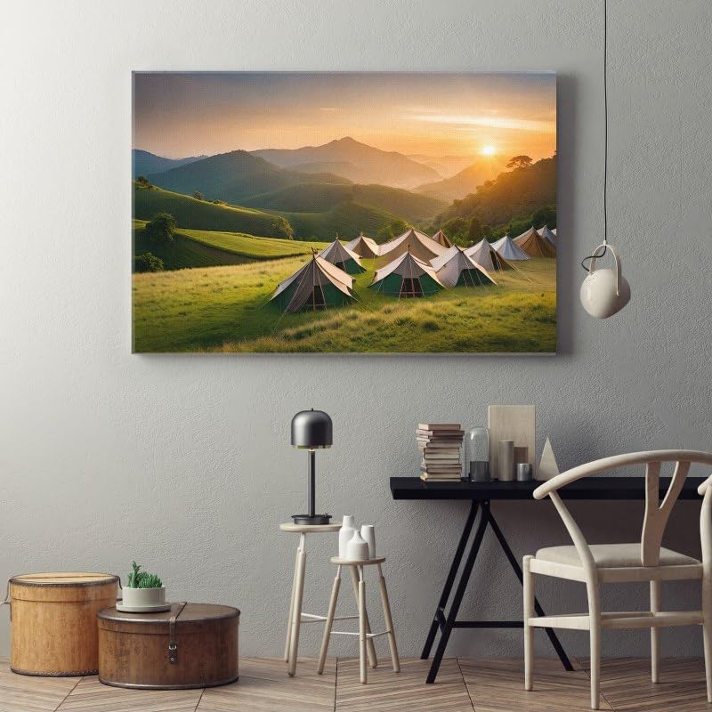 Home Gallery - خيمة تخييم مع منظر غروب الشمس والجبال لوحة جدارية قماشية مطبوعة 90 × 60، أخضر