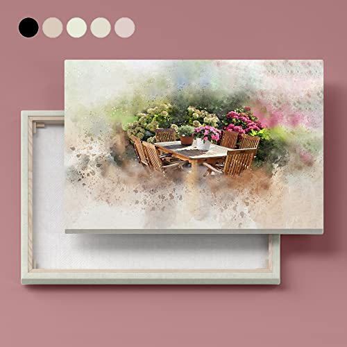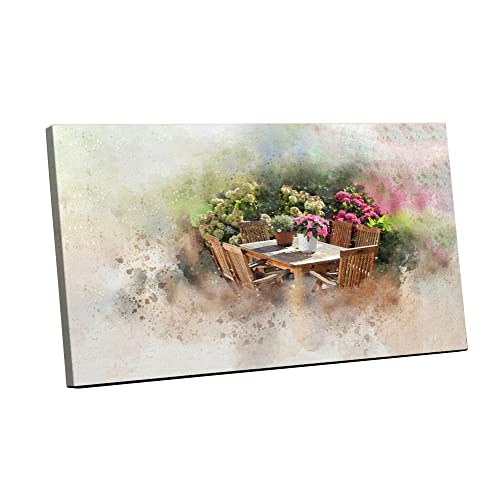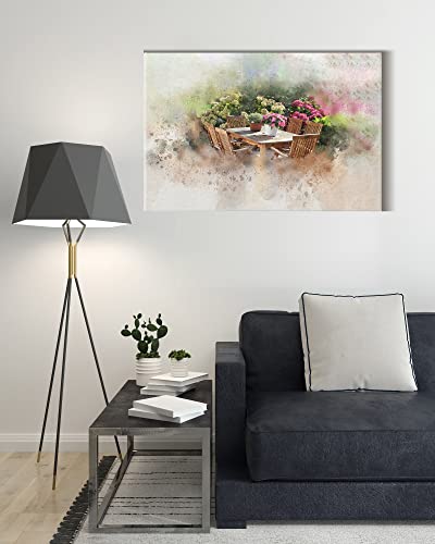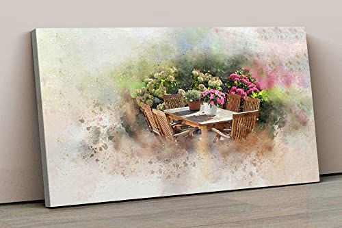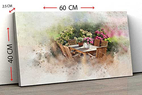 Home Gallery - تابلوه حائط قماش بإطار بتصميم تجريدي على شكل ترابيزة في حديقة عليها مجموعة أواني وزهور وشجيرات من هوم جاليري عرض 152 سم × ارتفاع 101 سم × عمق 5 سم