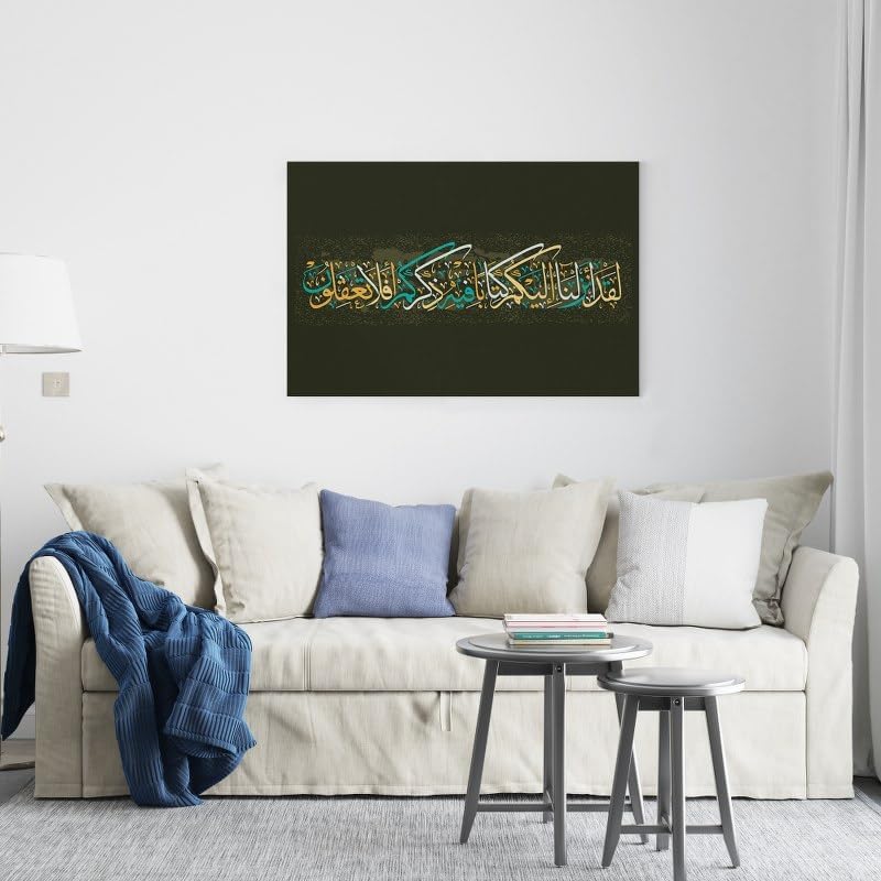Home Gallery - لوحة فنية جدارية قماشية مطبوعة بتصميم عبارة «لقد أنزلنا عليكم كتابًا فيه ذكركم افلا تعقلون» من هوم جالاري، مقاس 60×40 سم
