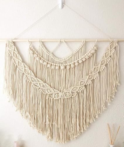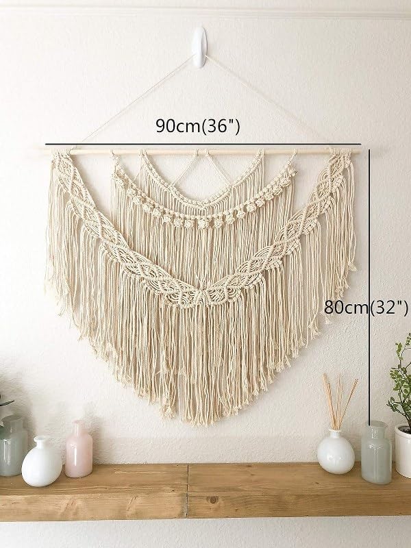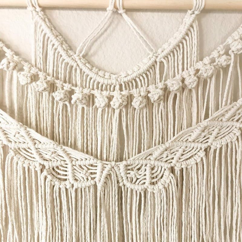 • - محتويات العبوة: مكرمية واحدة للتعليق على الحائط مع اثنين من المسامير المخفية وحبل من القنب وعصا خشبية.
