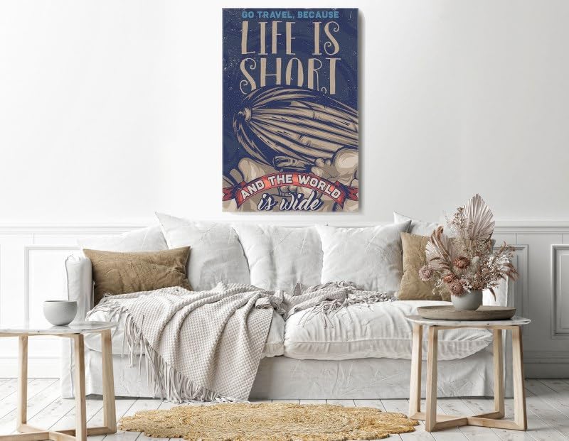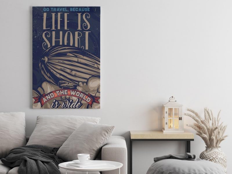 Home Gallery - لوحة فنية جدارية قماشية مطبوعة بعبارة Life is short and the world is wide مقاس 90 × 60 سم