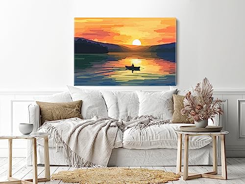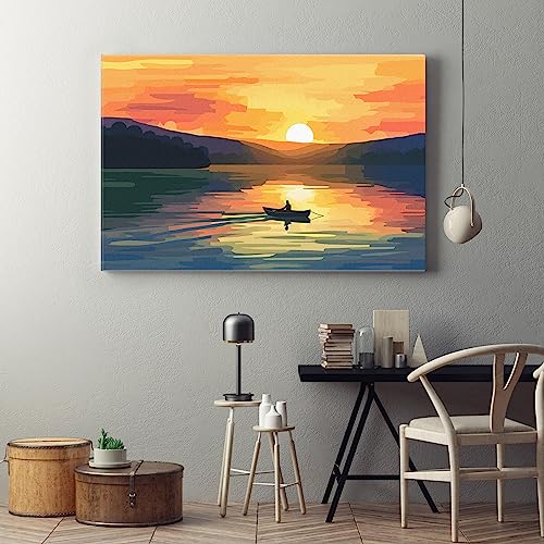 Home Gallery - لوحة فنية جدارية قماشية مطبوعة بتصميم رجل قارب وبحيرة مع غروب الشمس من هوم جاليري، مقاس 60 × 40 سم، برتقالي