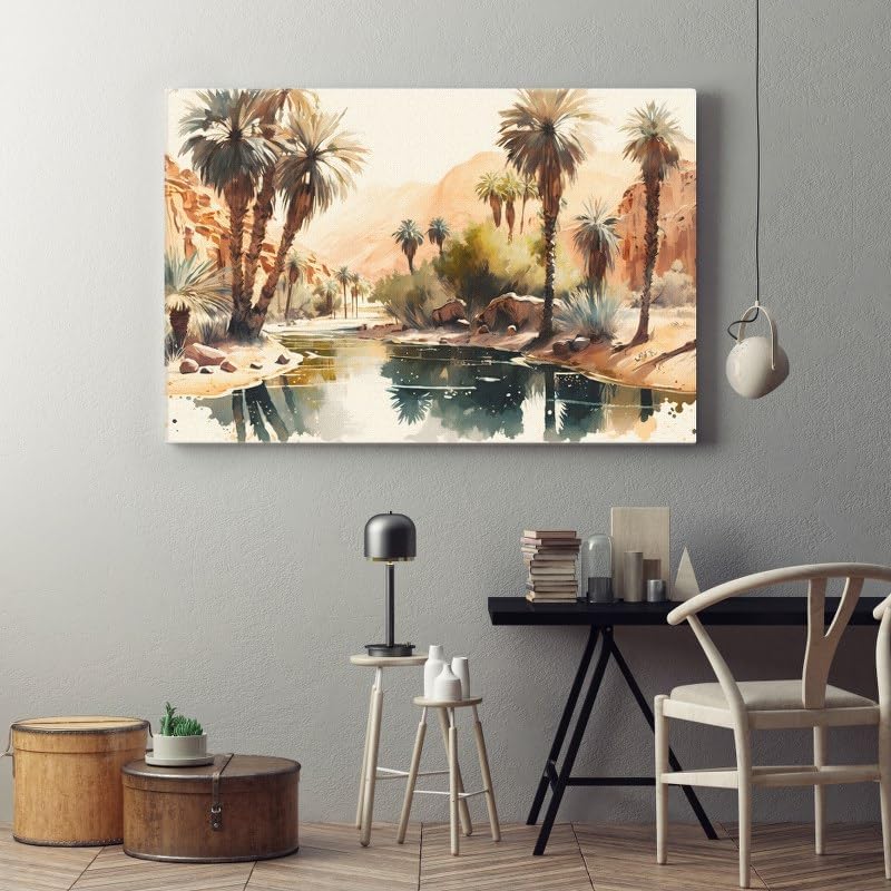 Home Gallery - لوحة فنية جدارية قماشية بطباعة نهر مع أشجار نخيل في صحراء مقاس 60 × 40 من هوم جاليري