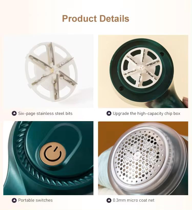 - شفرات ستانلس ستيل: مزودة بستة شفرات من الفولاذ المقاوم للصدأ لإزالة فعالة للوبر والكرات من الملابس والأقمشة