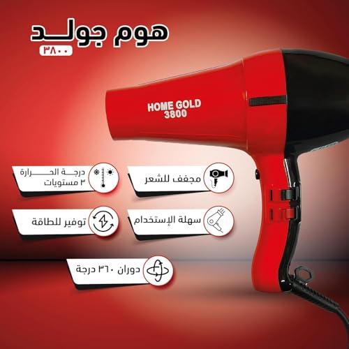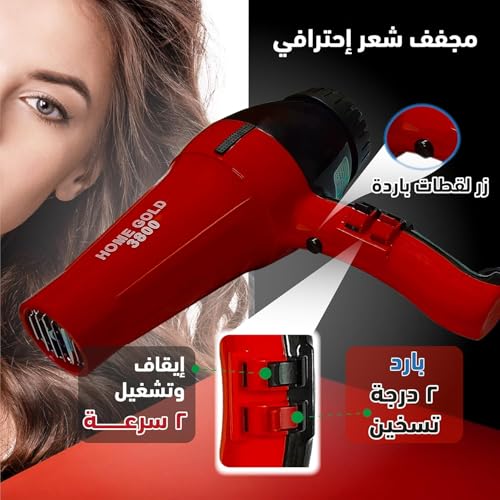 Generic - مجفف شعر احترافي من هوم جولد - نتائج بجودة صالونات التجميل في المنزل من 4 إعدادات للحرارة و2 سرعة ومقبض تشريحي - لجميع أنواع الشعر، 1500 وات، الطراز: 3800