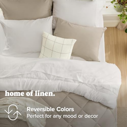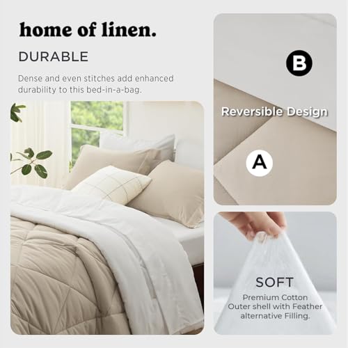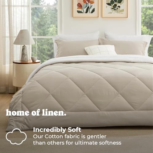 Home Of Linen - طقم لحاف ثقيل بوجهين مكون من 3 قطع من هوم اوف لينين - 2.8 كجم - حشوة بديلة للريش - (مقاس 1 م/1.2 م) - مقاس (1.8 × 2.4 م) + 2 كيس مخدة (50 سم × 70 سم) - أبيض × بيج