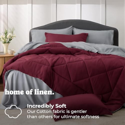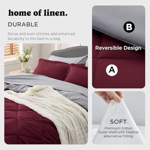 Home Of Linen - طقم لحاف ثقيل للاستخدام على الوجهين من هوم اوف لينين، 4 كجم، حشوة داخلية بديلة (للمرتبة 1.60 / 1.8 متر) - مقاس (2.30 × 2.40 متر) + 2 غطاء وسادة (50 × 70 سم)، 3 قطع، بورجندي × رمادي غامق، قطن