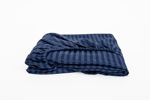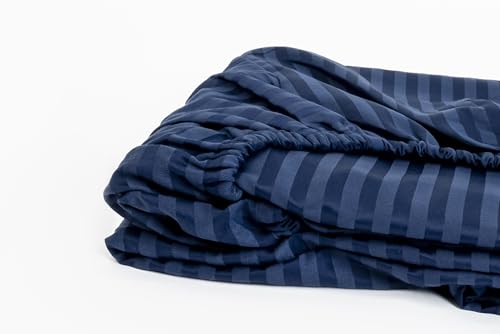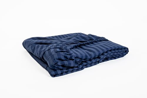 Home Of Linen - ملاية سرير بأستك مخططة من هوم اوف لينين، جودة عالية للفنادق وديكور المنزل، ملاية مسطحة واحدة 2.00 × 2.00 متر، تناسب المراتب بارتفاع حتى 30 سم، مصنوعة من القطن الممشط، لون أزرق غامق