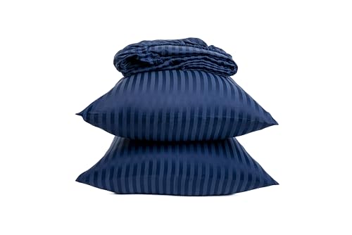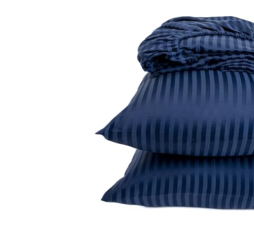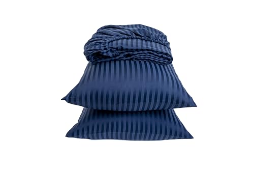 Home Of Linen - طقم ملاية بأستك مقلمة من القطن الممشط للفنادق وديكور المنزل هوم اوف لينين - 1 × مقاس 1.8 متر 2 + كيس مخدة 50 سم 70 - لمراتب يصل ارتفاعها إلى 30 - أزرق غامق كتان مُخطط