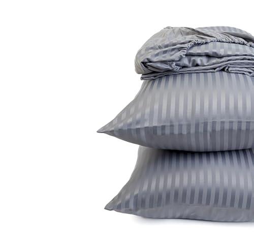 Home Of Linen - طقم ملايات قطن مصقول بحواف مطاطية مخططة بجودة عالية للفنادق وديكور المنزل من هوم اوف لينين 1 ملاية مثبتة مقاس 1×2 متر - 2 كيس مخدة 50×70 سم - لون فضي مُخطط