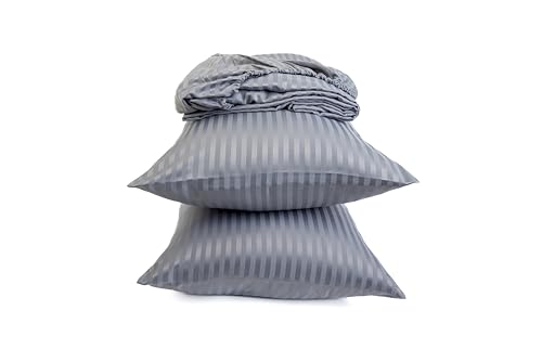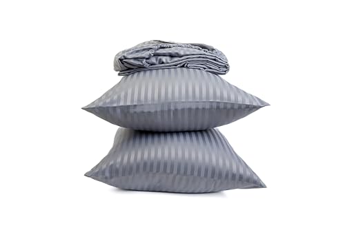 Home Of Linen - طقم ملاية مخططة بأستك من القطن الممشط للفنادق وديكور المنزل هوم اوف لينين - 1 × مقاس 1.8 متر 2 + كيس مخدة 50 سم 70 - لمراتب يصل ارتفاعها إلى 30 - لون فضي مُخطط