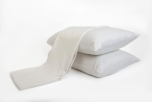 Home Of Linen - طقم ملاءة مسطحة مخططة للفنادق وديكور المنزل مكون من 1 ملاية مسطحة 2.40 متر × 2.40 متر + 2 كيس مخدة 50 سم × 70 سم مناسب للمراتب حتى 30 سم من قطن من هوم اوف لينين، أوف وايت