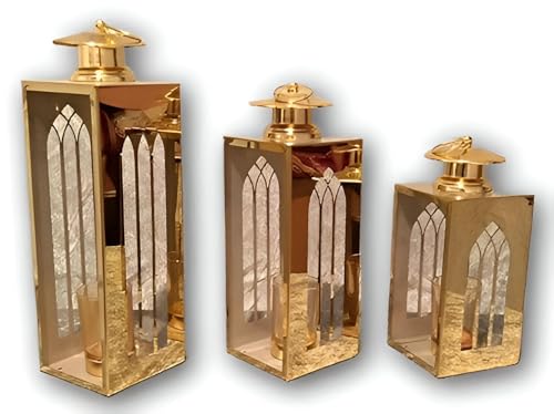 Generic - ديكور رمضان للمنزل - مجموعة من ثلاثة فوانيس ذهبية بمقاسات مختلفة، مصنوعة لإضافة توهج احتفالي دافئ إلى الغرف، سهلة الوضع على الرفوف أو الطاولات أو الرف، تتضمن خطافات تعليق للأجواء.