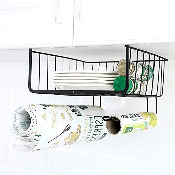 - سلة تخزين منزلية مصنوعة من الحديد تُوضع تحت ارفف وحدات التخزين.