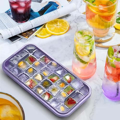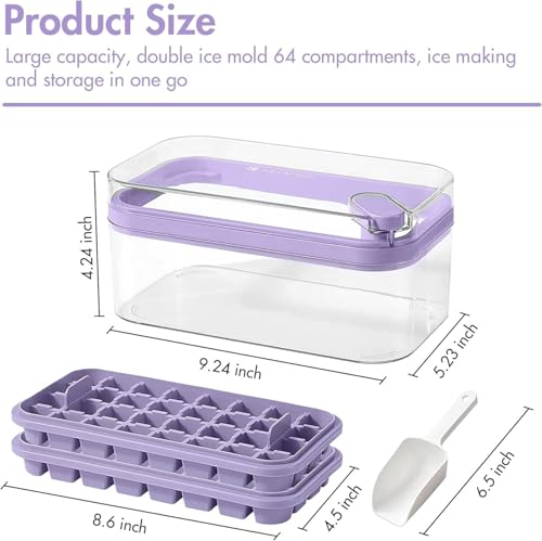 HomeCloud - قالب مكعبات ثلج من طبقتين مع غطاء وعلبة من هوم كلاود، قوالب مكعبات ثلج مربعة مع مغرفة ثلج، زر واحد سهل الفك، حاوية تخزين مكعبات الثلج خالية من مادة بيسفينول أ موفرة للمساحة، 64 مكعب ثلج، بنفسجي