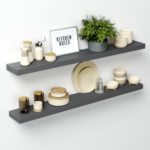Homeforia - هوم فوريا رف عائم رمادي 48 انش، ارفف عائمة من الخشب الحقيقي الصلب عالي الجودة 48 انش للتثبيت على الحائط، ارفف عائمة خشبية رمادية طويلة 48 انش، دعامة شديدة التحمل، 48 × 6.5 × 1.75 انش، مجموعة من قطعتين