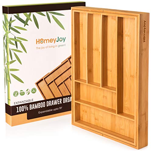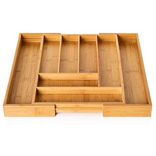 HomeyJoy - منظم ادراج ادوات المائدة الفضية من الخيزران 100% قابل للتوسيع - صينية مائدة خشبية فاخرة لمجموعة المطبخ - صديق للبيئة