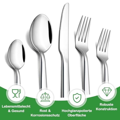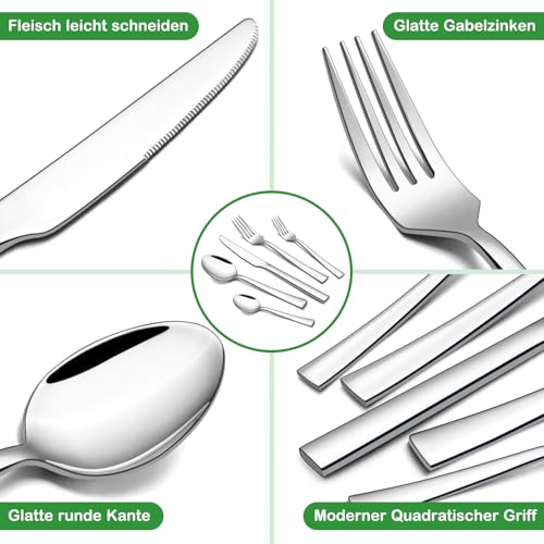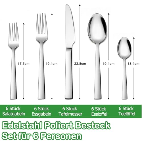 - مجموعة أدوات مائدة مكونة من 6 قطعة لـ 6 أشخاص: تتضمن مجموعة أدوات الطعام هذه 6 سكاكين عشاء، 6 شوكات عشاء، 6 شوكات سلطة، 6 ملاعق طعام، و6 ملاعق شاي، مما يجعلها اختيارًا مثاليًا للمناسبات الرسمية والعادية. يتميز تصميمها الحديث ويتناسب مع أي مجموعة أدوات طعام