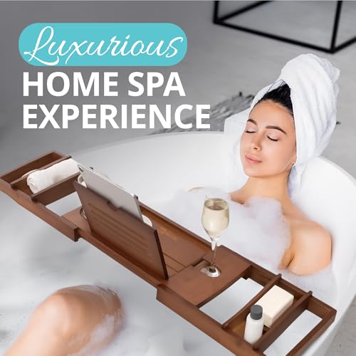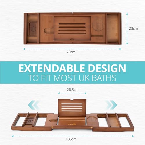 Homiu - صينية حمام من الخيزران - علبة حمام قابلة للتمدد - صينية حوض استحمام خشبية طبيعية مع شمعة نبيذ ومسند كتب وحامل آي باد وهاتف - ملحقات حوض استحمام فاخرة - ملحقات جاكوزي من هوميو (بني)