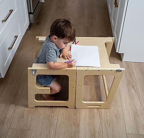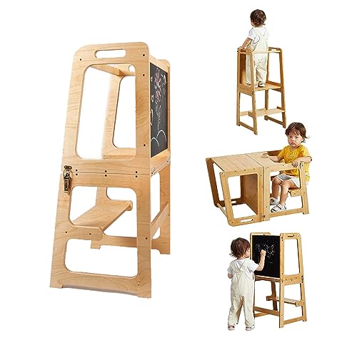 Homodoskey - كرسي مطبخ 4 في 1 من هومودوسكي، كرسي صغير للحمام ومساعد تعلم للأطفال الصغار من عمر 18 شهر إلى 6 سنوات - كرسي صغير للحمام مثالي للمنضدة مع سبورة وطاولة مكتب وكرسي، لون الخشب الطبيعي