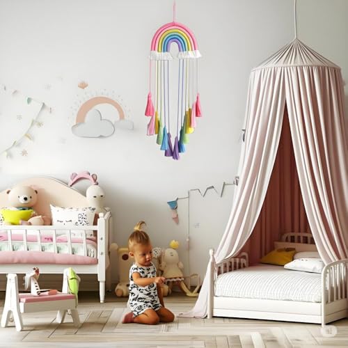 Honcas - مكرمية معلقة على الحائط بألوان قوس قزح - نسيج قطني منسوج يدويًا بشراشيب لديكور غرفة الأطفال والحضانة وديكور المنزل (قوس قزح وردي) من هونكاس