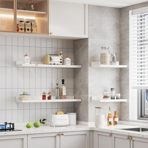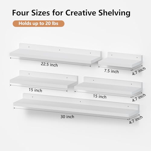- مجموعة متعددة المقاسات من 5 قطع: لا مزيد من القيود ذات المقاس الواحد الذي يناسب الجميع، ولكن أربعة أحجام للرفوف الإبداعية. مع رف 30 انش يثبت ديكور أكبر بينما تحمل الزاوية 7.5 انش شمعة أو صورتك المفضلة. في الحمام، قم بتجميع زوج 15 انش لتنظيم أدوات التجميل، والحفاظ على الطاولات خالية من الفوضى، بينما تضيف اللوحة مقاس 22.5 انش بقعة مصقولة للمناشف