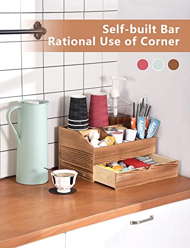 HONIZER - منظم بدرج لمحطة عمل القهوة، ملحقات خشبية لبار القهوة، حامل أكياس الشاي على سطح المكتب، صندوق تخزين بنمط بيت المزرعة للأكواب والسكر وكبسولات القهوة والمشروبات والتوابل ومبيض القهوة من هونيزر