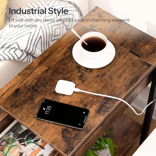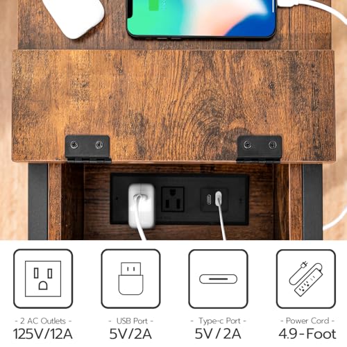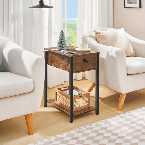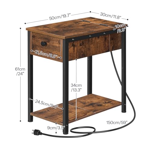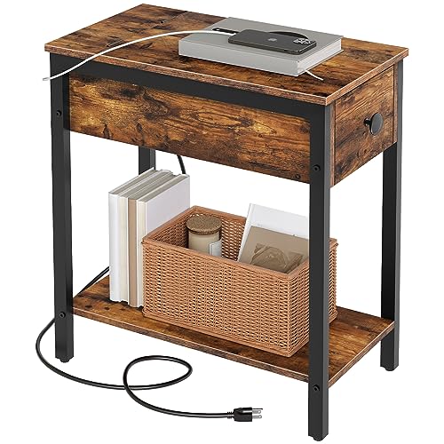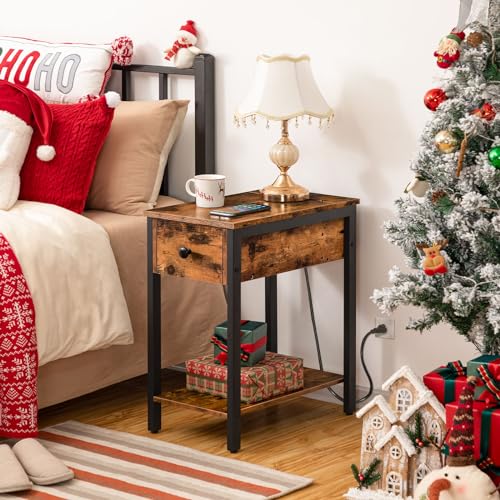 HOOBRO - طاولة جانبية صغيرة مع قاعدة شحن، طاولة كومودينو بمظهر خشبي عتيق مع أرفف تخزين ودرج، مزودة بمنافذ USB ومنافذ طاقة مناسبة للمساحات الصغيرة وغرفة المعيشة وغرفة النوم، لون راستيك براون من هوبرو
